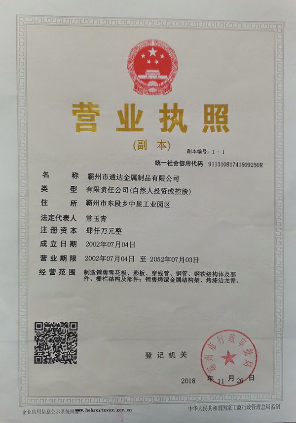 • 河北省霸州市通達金屬制品有限公司是一家生產熱鍍鋅管<預鍍鋅管>及熱鍍鋅板帶的生產企業。公司具有很強的經濟實力。本 公司地理位置優越,交通便利,處于京津保滄四大城市交匯中心的勝芳鎮。由于公司不斷發展壯大,良好的投資環境為我公司的發展提供了可靠的保障。本公司是河北省重合同守信用企業,被評為AAA級信用企業
